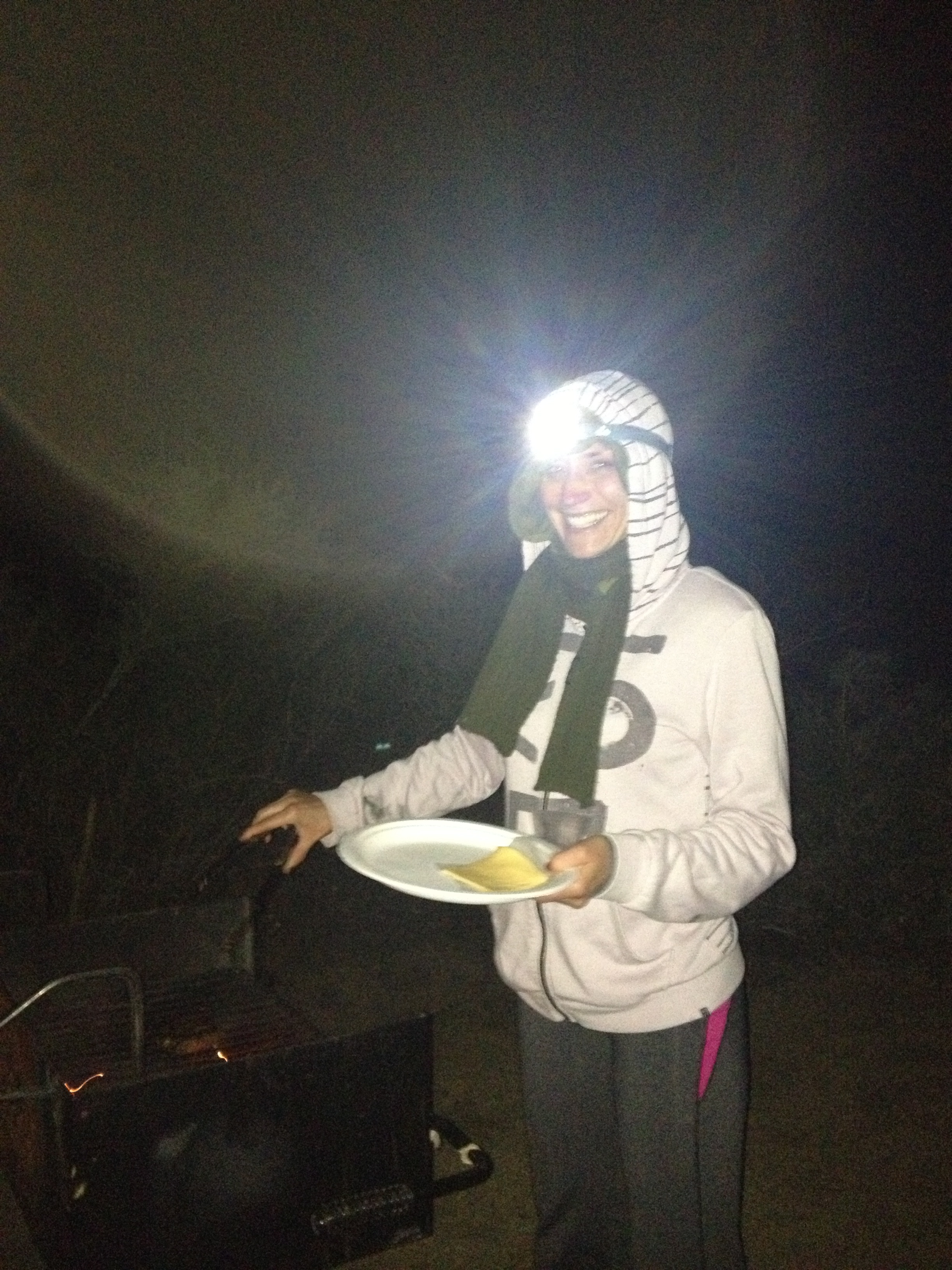 Cooking some hamburgers on the grill with Jim’s handy head light which he insisted I would need and he was SO right!!